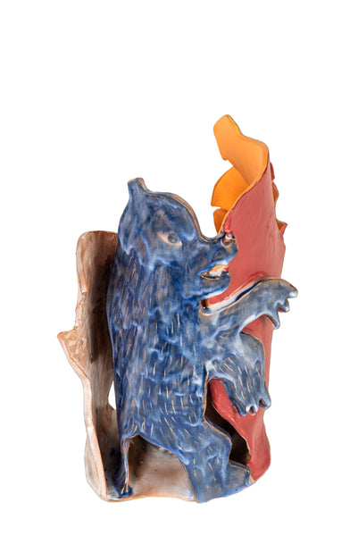 El Olso Vase is part of a collage vase series, where each piece is constructed from multiple facets. Each facet represents a flat-cut figurative element, carefully assembled to create a rich, dynamic three-dimensional form. These vases tell a story that unfolds across every surface, inviting the viewer to move around the piece to discover all its details. In El Olso, the narrative is a contemporary reinterpretation of Monsieur Seguin’s Goat. One can discern a profile of a blue bear, a goat, and a standing bear, each figure contributing its own expressiveness to the overall story. The interplay of these forms transforms the vase into a visual narrative, where shapes and volumes converse, blending imagination with literary memory. You can read more about Marion and her work here.